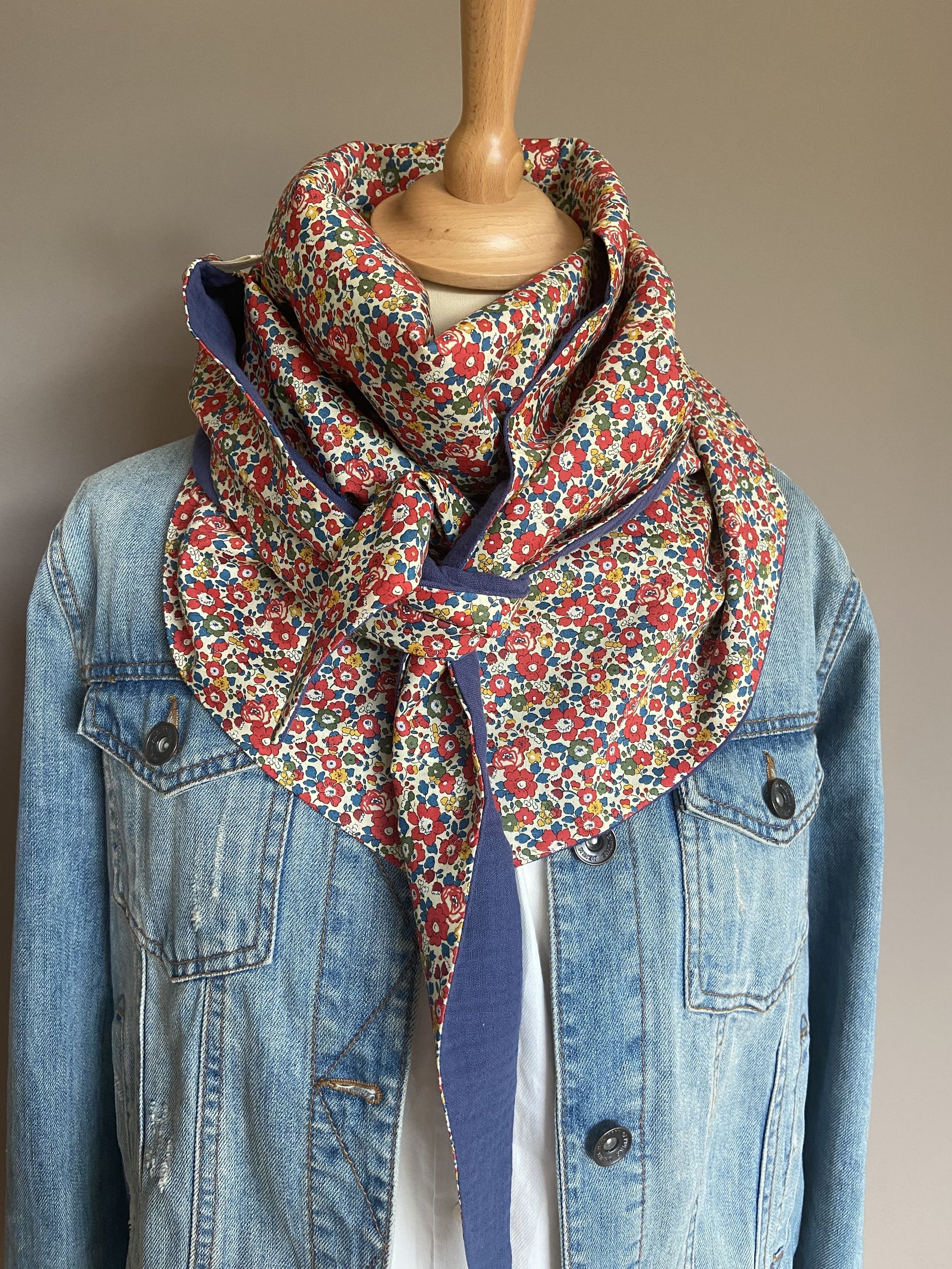Le chèche en Liberty est un intemporel, il est idéal porté tant avec une robe qu'avec un pantalon.