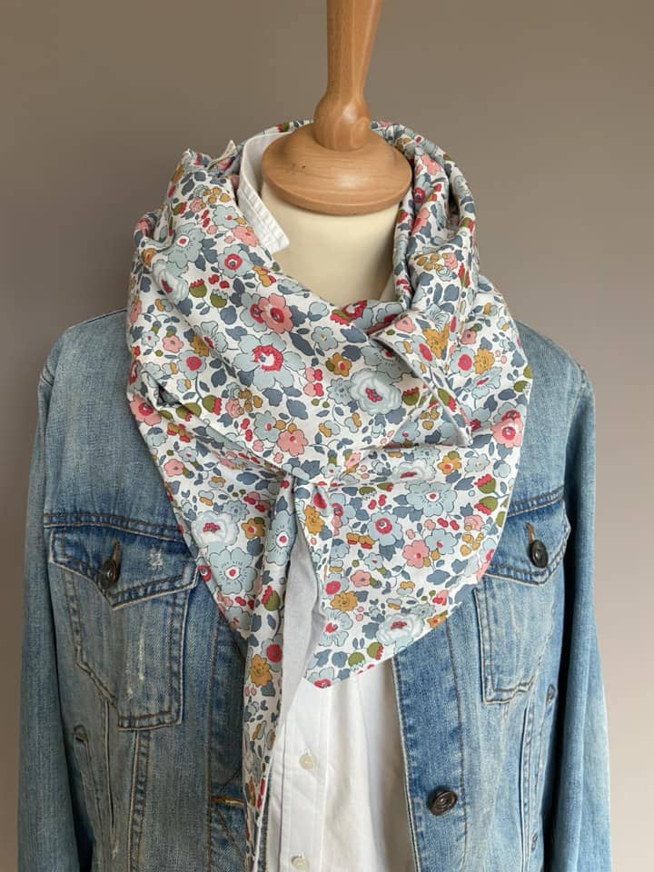 Le chèche en Liberty est un intemporel, il est idéal porté tant avec une robe qu'avec un pantalon.