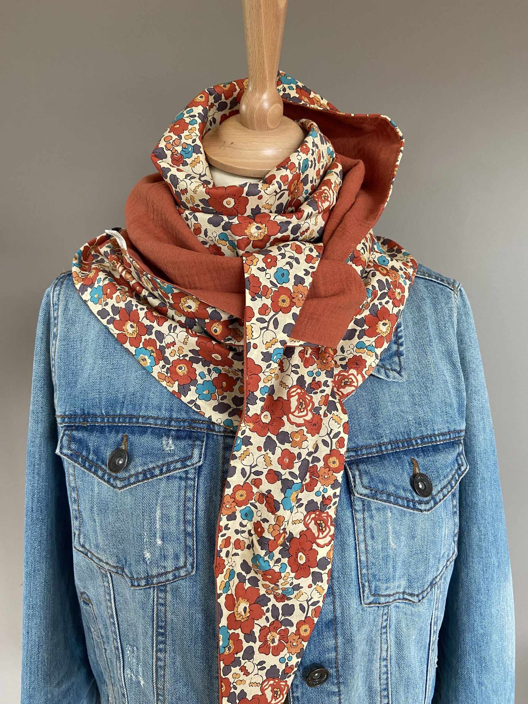 Ce modèle est en liberty "Betsy Terracotta", la doublure en double gaze rouille foncé.