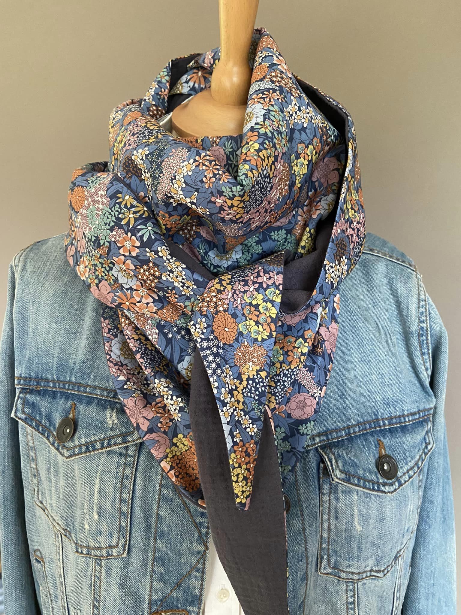 Le chèche en Liberty est un intemporel, il est idéal porté tant avec une robe qu'avec un pantalon.