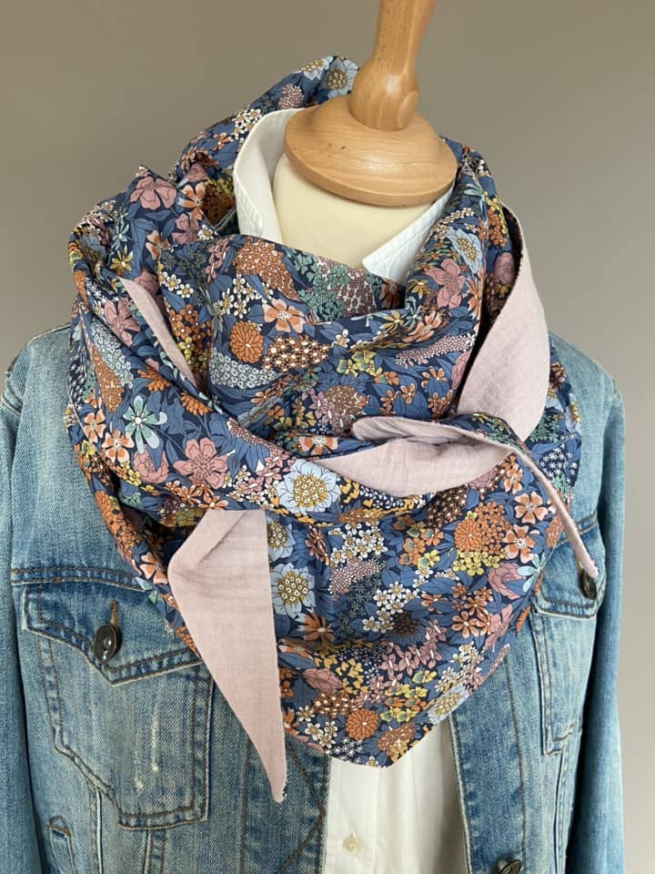 Ce joli et grand foulard triangle (chèche) est en véritable tissu "Liberty of London" entièrement doublé en double gaze.