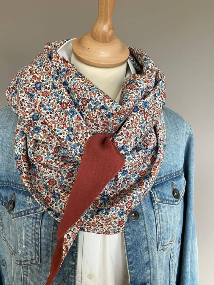 Ce modèle est en liberty "Emma & Georgina rouille", la doublure en double gaze brique foncé.