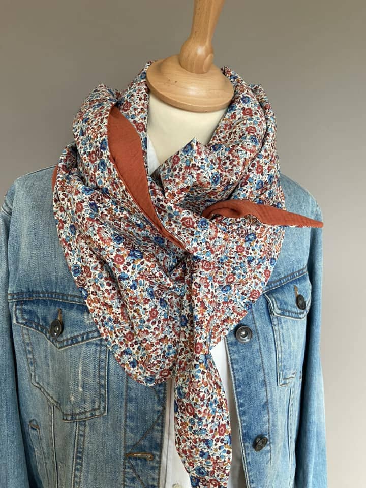 Ce joli et grand foulard triangle (chèche) est en véritable tissu "Liberty of London" entièrement doublé en double gaze.